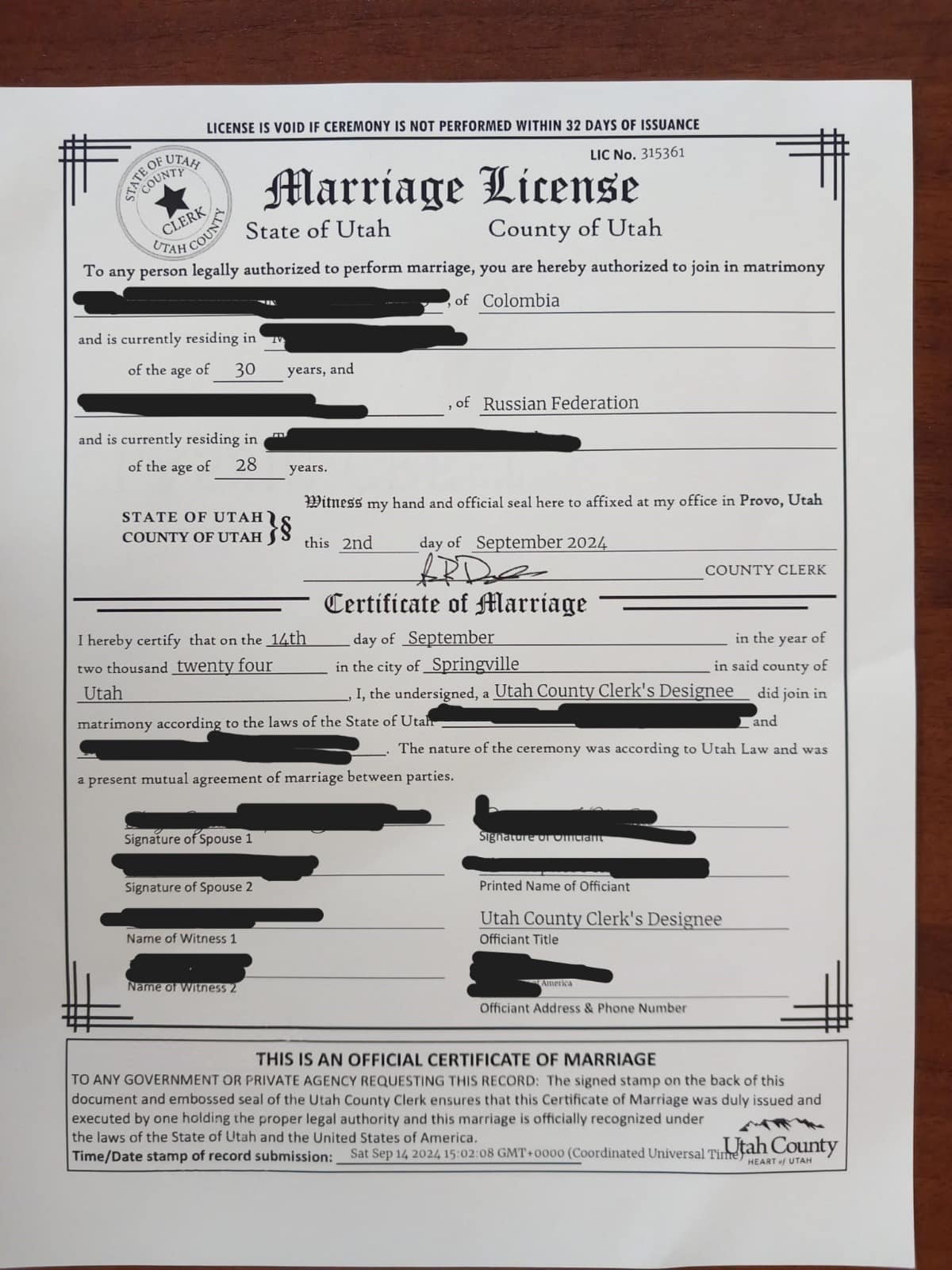 После церемонии оформляется свидетельство о браке. Оригинал документа из офиса регистратора округа Юта отправляется почтовой службой FedEx. Это гарантирует сохранность и скорость. Именно этот документ с “мокрой” печатью и подписью секретаря округа является базой для дальнейших действий.