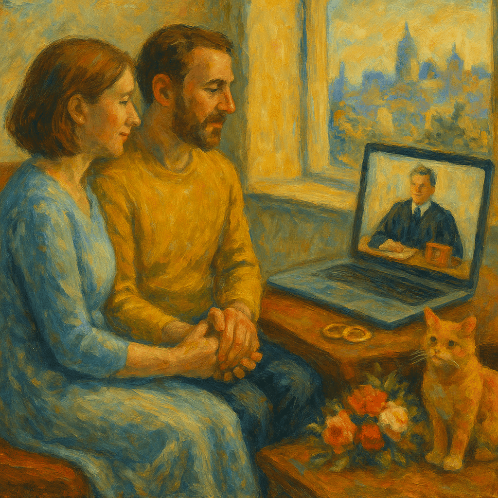 Это официальный, признанный, юридически действующий брак, который можно заключить прямо из дома — без поездок, без очередей, без религиозного контроля.